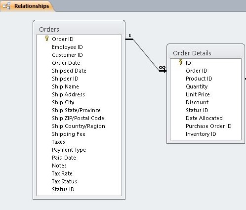 The most common relationship is One-to Many where one record in the first table has a Foreign Key from a second table that could have many entries. In the example below one Order could have many Order Details. Order Details would be the line items that hold the details for the Order.